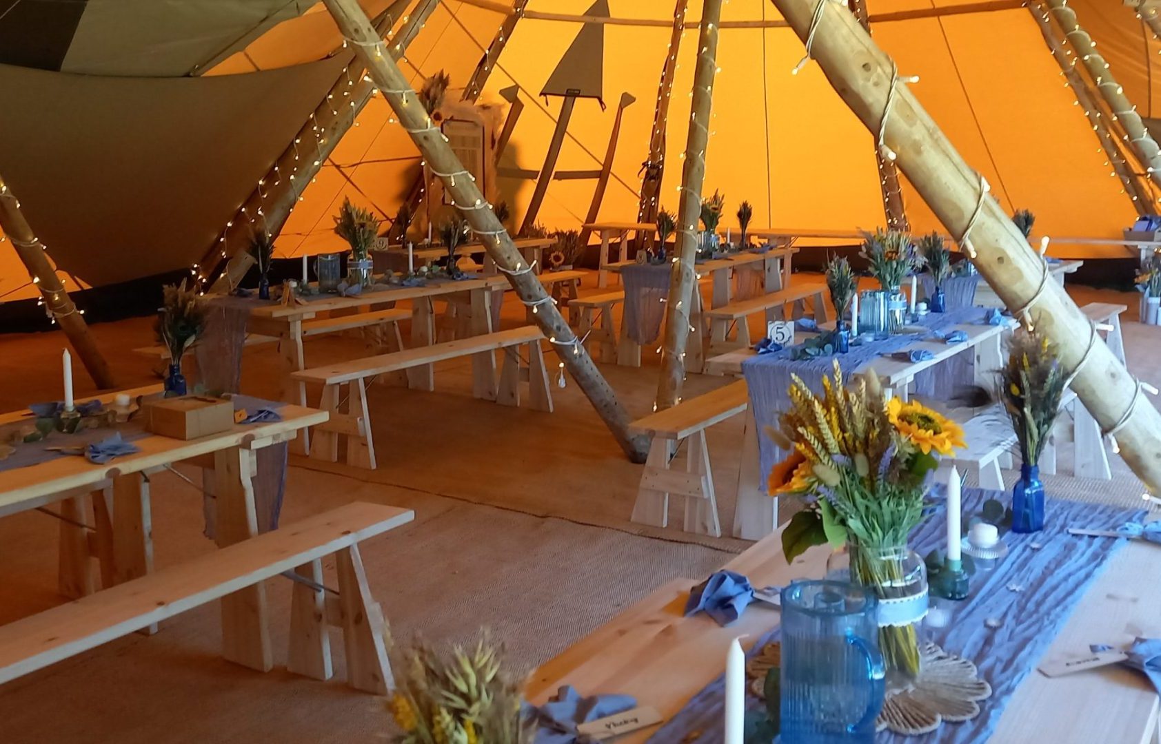 The Tipis can be hired individually or both together. Included with the Tipi hire are rustic tables and bench style seating, rush mat flooring, fairy lights and 6 up lights if required.